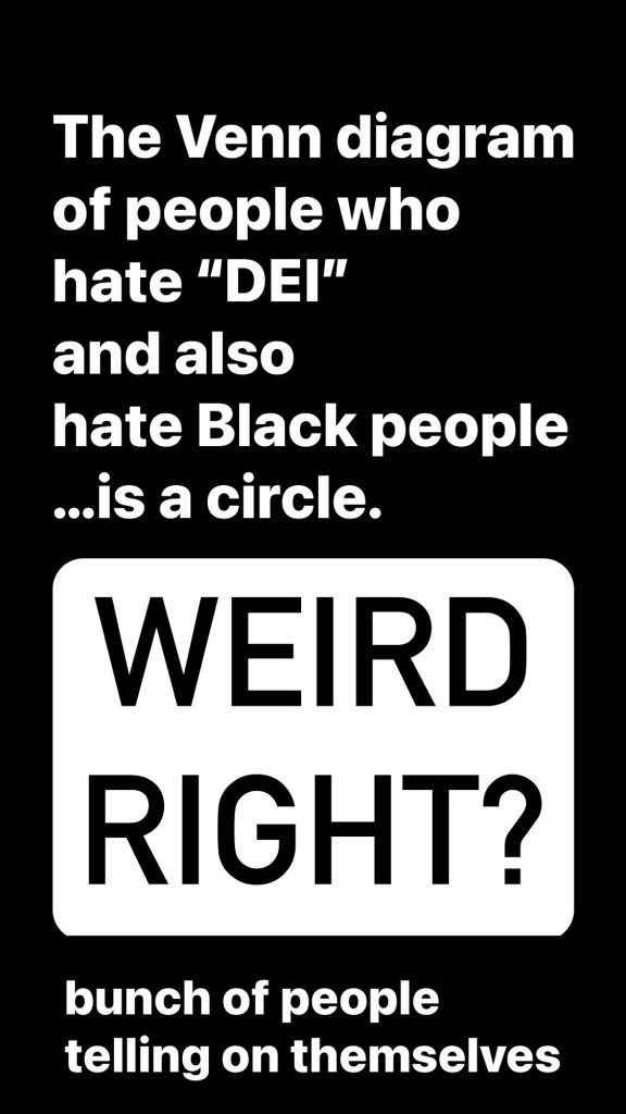 The Venn diagram of people who hate “DEI” also hate Black people. Weird, right? Bunch of people telling themselves.