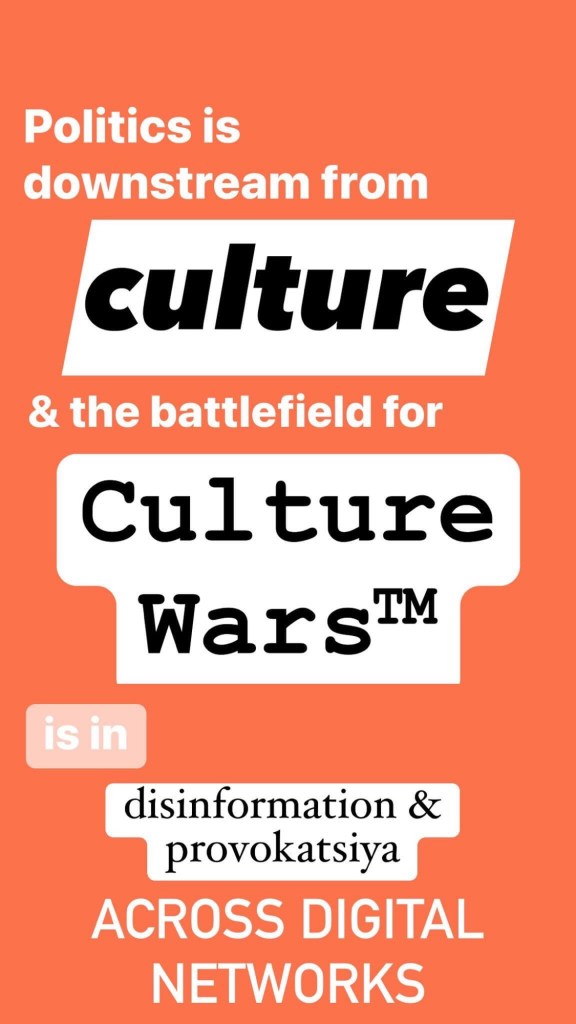 The thing about culture is the word is derived from “cult”. A cult is not monolithic nor fixed or even logical.If you’re not appropriating and remixing culture, you’re just basicFor me, culture is “how we do things around here. Per Danilo Campos, “culture is how we nourish each other spirits”. If your culture is not nourishing nor representative, what are you doing, bro?Politics is downstream from culture. Battlefield for Culture Wars™ is in disinformation and provokatsiya across digital networks.