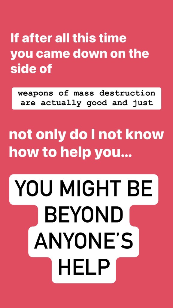 If after all this time you came down on the side of “weapons of mass destruction are good and just”, not only do I not know how to help you, you might be beyond anyone’s help