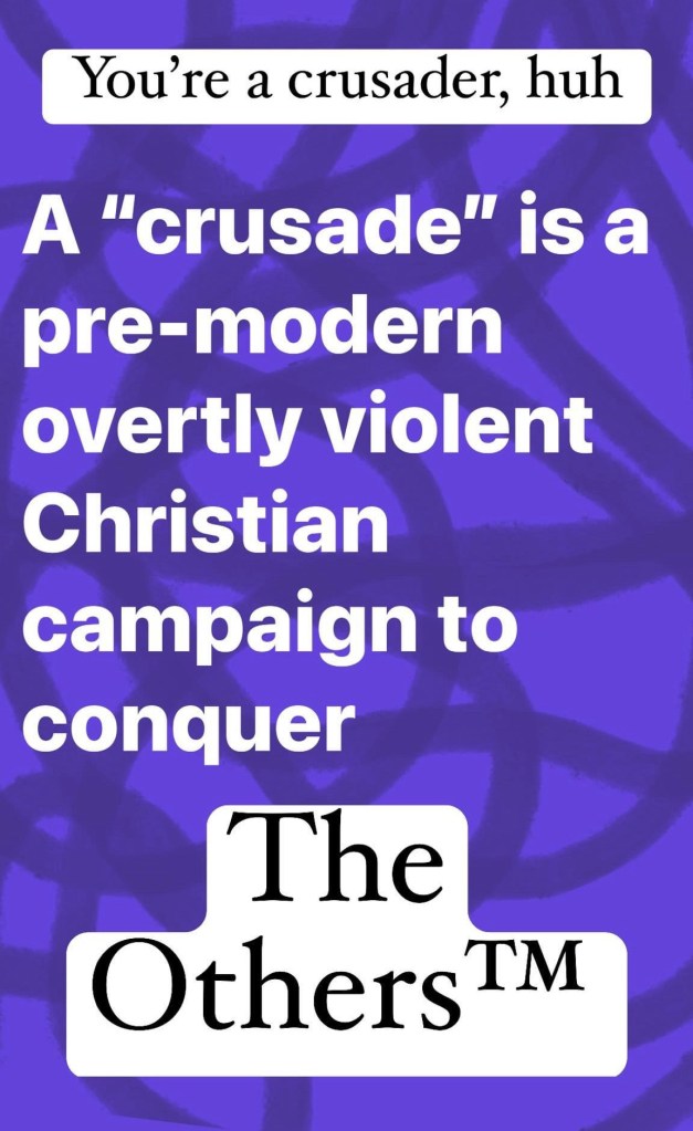 You’re a crusader, huh? A “crusade” is a premodern overly violent Christian campaign to conquer The Others™